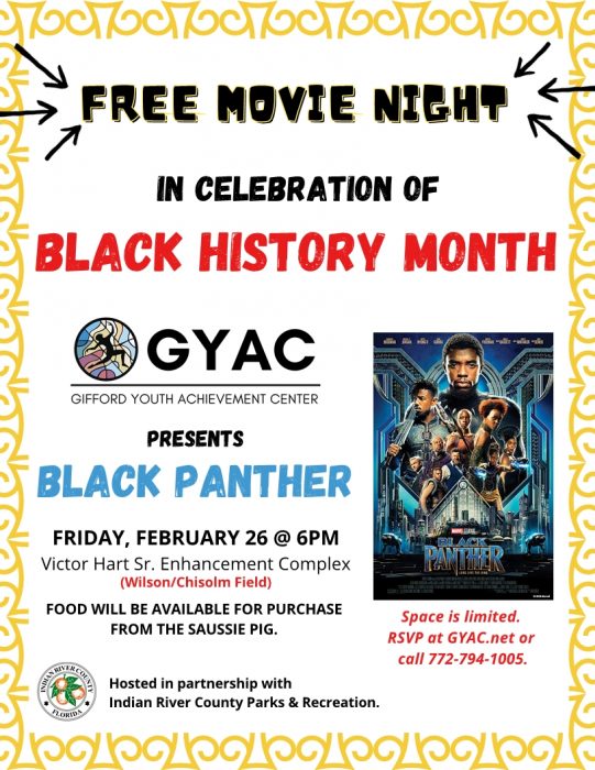 Together, the Gifford Youth Achievement Center (GYAC) and the Indian River County Parks and Recreation department, are celebrating Black History Month by hosting a free outdoor flick on Friday, February 26 at 6:00 p.m. The movie night will take place at the Victor Hart Sr. Enhancement Complex on Wilson/Chisolm Field, located at 4715 43rd Avenue in Vero Beach.