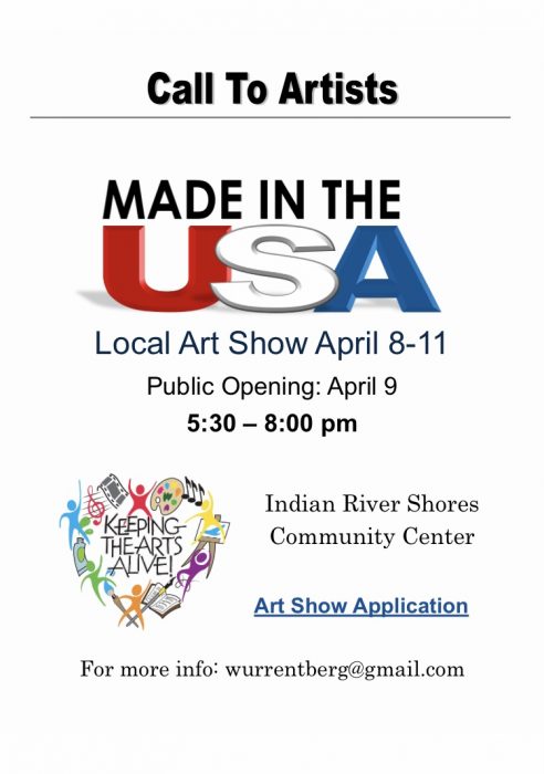 “Keeping the Arts Alive” invites the public to an opening reception Friday April 9th at 6:00 pm at Indian River Shores Community Center, 6001 Florida A1A, Vero Beach, Florida 32963.