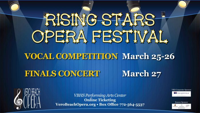 Vero Beach Opera presents Rising Stars Opera Festival, Thursday – Saturday, March 25 – 27. Semi-Finals:Thursday, March 25, 2-5pm. Finals: Friday, March 26, 2-5pm. Rising Stars Concert: Saturday, March 27, 7pm. Performing Arts Center at VBHS. Online Ticketing: VeroBeachOpera.org