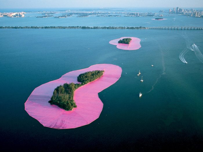Closer to home, Christo’s Surrounded Islands in 1983 was created in Miami and consisted of 11 spoil islands in Biscayne Bay, each outlined with pink polypropylene fabric, 6.5 million square feet of which was produced by special order in Germany. More than 400 people were involved in constructing the work.