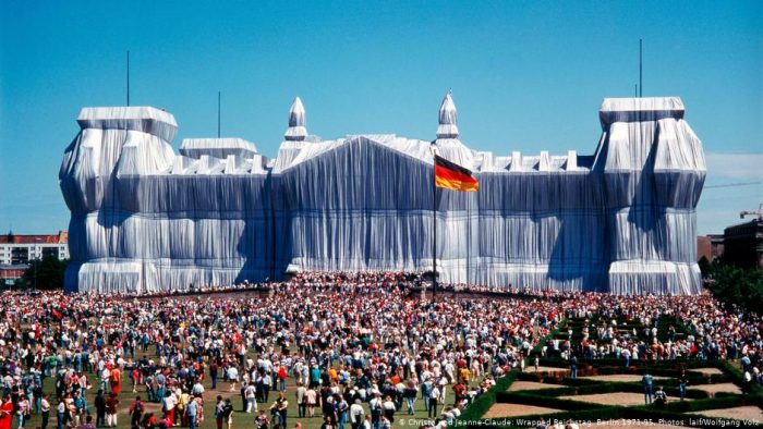 Some examples of their work include the Wrapped Reichstag. In 1995 Christo and Jeanne-Claude literally wrapped the Berlin Reichstag (parliament) building with 100,000 square meters of silver fabric. It was the result of 24 years lobbying German officials.