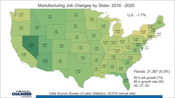 Among other diverse economic growth, Florida’s economy has added manufacturing jobs (+6.0%) while the U.S. lost them (-1.7%), landing at #2 in total manufacturing job creation over the past 5 years, and #5 in growth rate. *See graphic below.