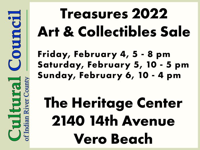 Count on finding antiques, vintage and collectible items to fit all budgets. Shop for a bargain, find a treasure! Friday, February 4, 5 – 8 pm Saturday, February 5, 10 – 5 pm , Sunday, February 6, 10 – 4 pm. The Heritage Center, 2140 14th Avenue, Vero Beach
