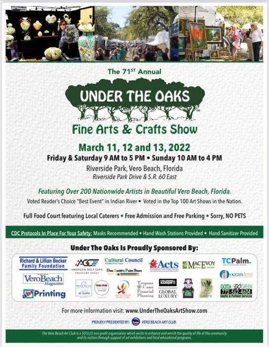 Vero Beach Art Club brings the 71st Annual Under The Oaks Fine Arts & Crafts Show, March 11, 9 – 5 pm, March 12, 9 – 5 pm & March 13, 10 – 4 pm to 3280 Riverside Park Drive, Vero Beach. This show gathers over 200 artists from around the nation and beyond to exhibit at this highly respected juried show. Voted in the Top 200 Art Shows in the Nation by Art Fair Source Book and in the Top 200 Art Shows in Florida by Sunshine Artist. Over 50,000 visitors attend this popular crowd favorite in shady Riverside Park.