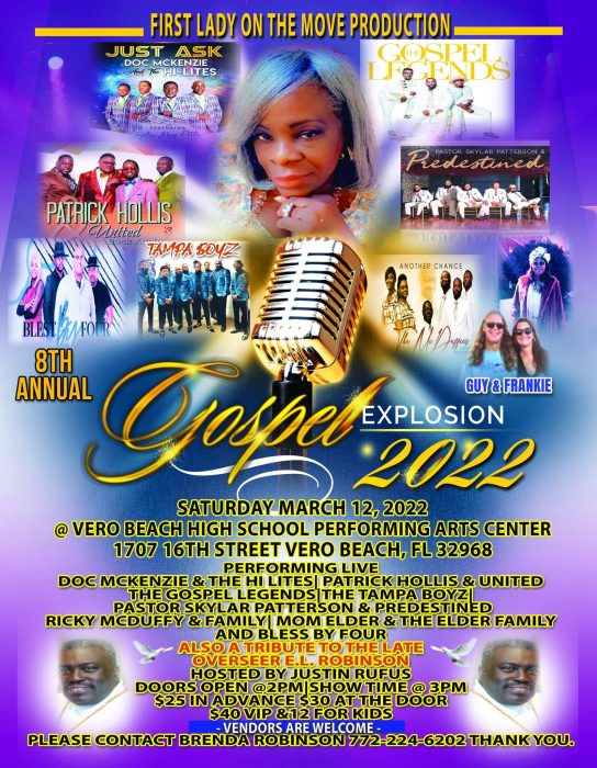 Doors Open at 2 pm. Performances: Doc McKenzie & The Hi Lites, Patrick Hollis & The United, The Gospel Legends, The Tampa Boyz, Pastor Skylar Patterson & Predestined, Ricky McDuffy & Family, Mom Elder & The Edler Family & Bless by Four. Performance at Vero Beach High School Performing Arts Center, 1707 16th Street, Vero Beach