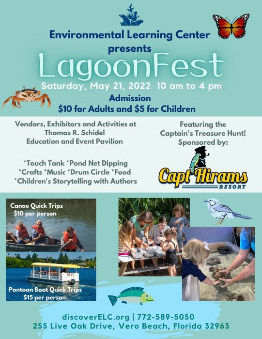 LagoonFest activities and experiences will be set up in various areas across the ELC property and include Canoe Quick Trips and Pontoon Boat Rides. Captain Hiram’s is sponsoring a treasure hunt for children. Admission to LagoonFest is $10 for adults and $5 for children age 11 and under. Canoe Quick Trips are available for $10 and 45-minute Pontoon Boat Rides are $15. Time slot reservations can be made on-site the day of the event. Eco-friendly exhibitors and vendors will be set up on the grass lawn area called the Oval in front of the new Thomas R. Schidel Education and Event Pavilion. Entertainment includes Vero Beach Pipes and Drums at 11:30 AM and music throughout the day from Barwick Entertainment.