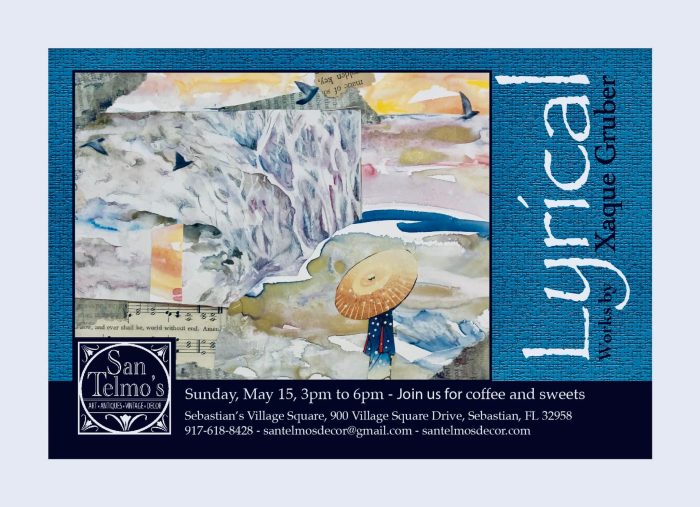 Xaque Gruber’s new art exhibit “Lyrical” are whimsical watercolor paintings, drawings and mixed media pieces inspired by song lyrics, nursery rhymes and poetry. San Telmo Décor, 900 Village Square Drive, Sebastian. On view through the month of May.