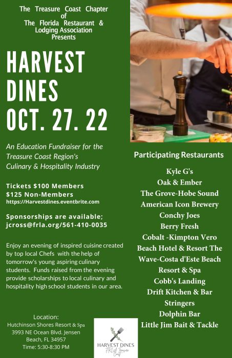 The Florida Restaurant & Lodging Association (FRLA) – Treasure Coast Chapter proudly presents Harvest Dines. FRLA brings together restaurants, culinary talent, and area schools to showcase our local talent. Fifteen FRLA partners along with students from local high schools will team up with renowned chef’s who will blend their talents to bring about a memorable evening filled with live music, food as well as some incredible auction items. The event will be held on