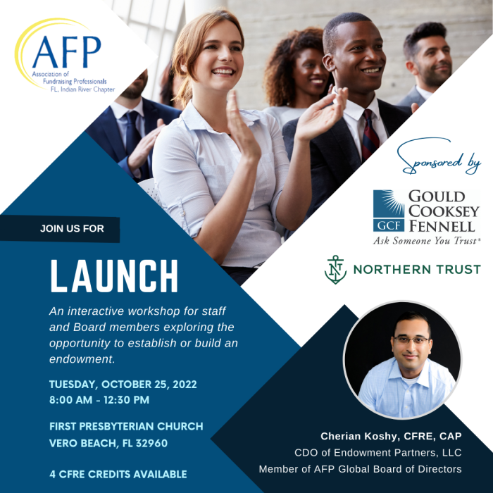 Hosted by the Association of Fundraising Professionals (AFP) Indian River and sponsored by Gould Cooksey Fennell and Northern Trust, the workshop will allow participants to leave with a vision, sample documents and the next steps to establish or grow an endowment program. Leading the training is Cherian Koshy, a certified fund raising executive (CFRE) with more than 25 years of experience leading organizations in scaling revenue growth. Mr. Koshy is widely recognized as one of the most sought-after trainers and speakers in the nonprofit sector and serves as a member of the AFP Global Board of Directors.