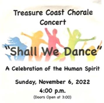 November 6, 4pm at First Baptist Church of Vero Beach. The public is invited to add the Treasure Coast Chorale to their dance card as they perform a variety of dance songs in their next exciting concert“Shall We Dance”. The performance will recognize dance expressions through songs such as the medley “Dance Evolution”, which includes songs such as “The Twist”, Cotton Eye Joe” and “YMCA”. Some talented special guests have been invited to perform this musical performance including guitarist Dave Mundy, drummer Richie Mola, and the Dolls, Vero’s popular oldies trio. Piano accompaniment will be provided by Judy Carter.