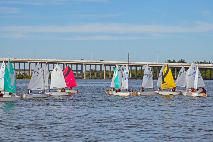 Sunday, November 6 dawned with a mix of sun and clouds and a steady 15 knot east wind blowing in off the Atlantic as sailors from up and down the east coast of Florida streamed into Youth Sailing Foundation’s (YSF) marine recreation park south to the 17th Street Bridge. Towing sailboats and coach/safety boats, over fifty sailors and their families came to Vero Beach to compete in Youth Sailing Foundation’s Veteran’s Day Regatta.