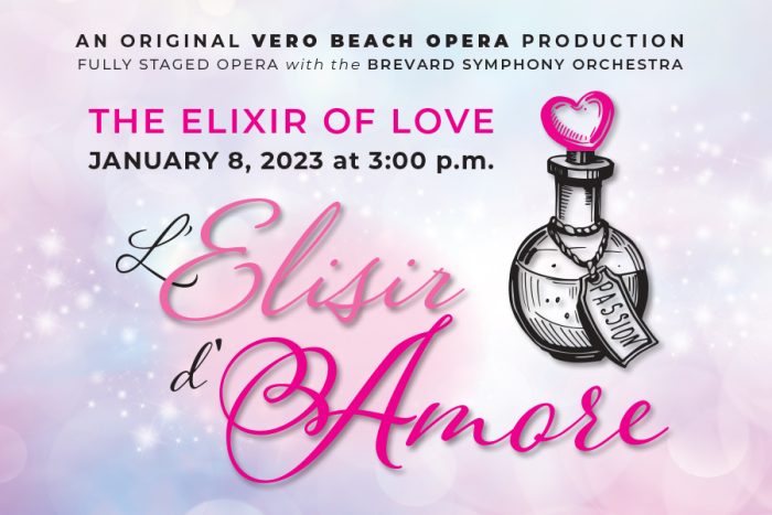 Vero Beach Opera will present an original production of Donizetti’s L’Elisir d’Amore (The Elixir of Love), with stage direction by Vero Beach Opera Artistic Director Russell Franks. Maestro Christopher Confessore will conduct the Brevard Symphony Orchestra. Costumes will come in from Norcostco Costume Co., and sets from Stivanello Costume Company, Inc.