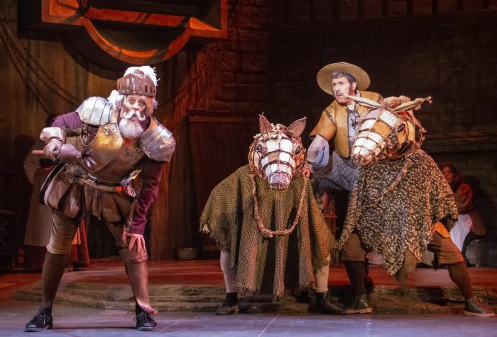 In a twist on the One Thousand and One Nights tale, he offers to convince his fellow prisoners not to steal a chest he brought with him by weaving a fanciful story about Don Quixote, a knight-errant seeking adventure with his sidekick, Sancho Panza. He transforms himself from the everyman Cervantes into the fantasy knight Don Quixote taking simple makeup from that chest and using props lying around the prison.