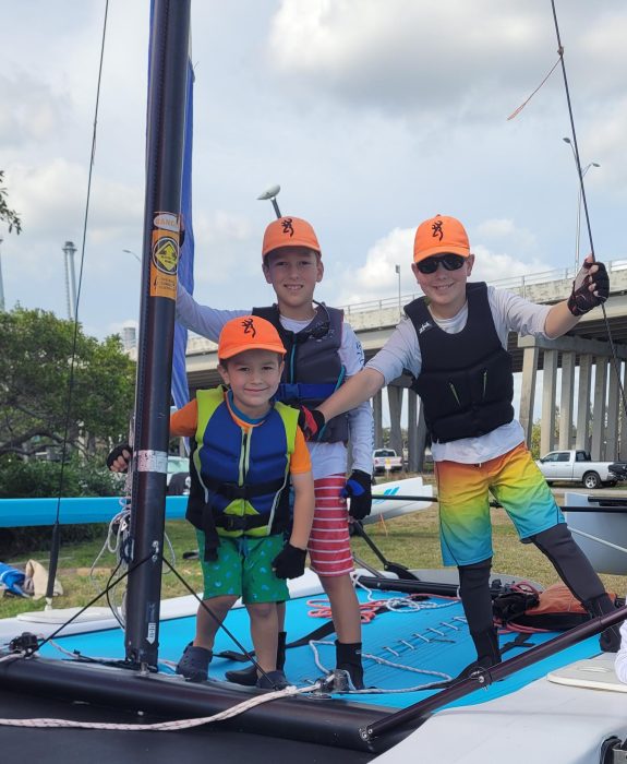 It was a warm friendly gathering of a diverse group united with a common passion for sailing. Ages ranged from 3 to 80. Pre-school siblings hopped aboard with parents as their older brothers and sisters skippered the colorful catamaran sailboats. It was quite a scene! As one set of parents was about to board they asked Associate Executive Director Julia Linus who was skippering their boat. When Julia informed them their 11-year old son had the helm, the wide-eyed expression of surprise and pride was priceless.