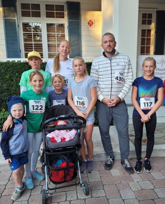 The entire Team Poole was ready for the 5K race about 30 minutes later. Christina and Jeff had all seven children ready to go, including four-month-old Gloria.