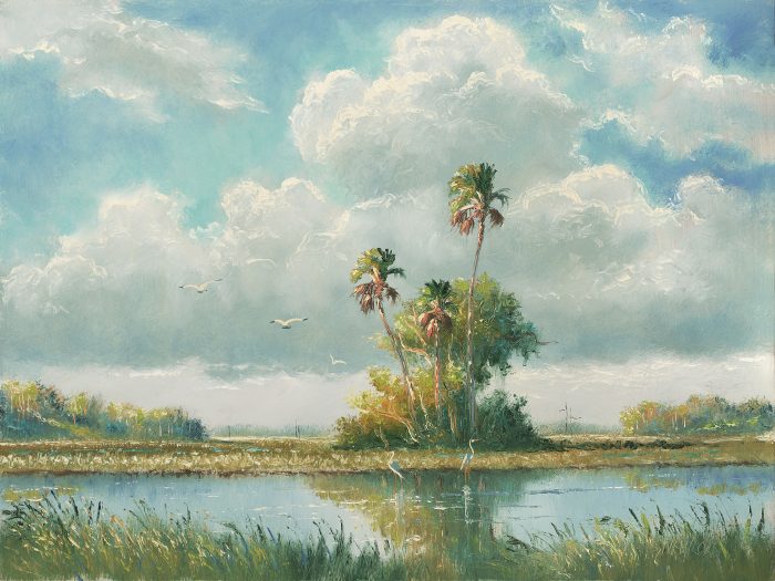 This year, that masterpiece is a spectacular 18″ x 24″ oil painting by Sam Newton (b.1948), Original Highwaymen artist and inductee to the Florida Artist Hall of Fame. “Beautiful Morning,” 2005, eloquently captures the iconic beauty of Florida’s wild and wide terrains, through the eyes of one of the original masters of the beloved and unique landscape painting tradition that began here. This exceptional work of art is valued at $6,500. The Backus Museum is grateful to Highwaymen Art Specialists for this generous donation to assist us in our nonprofit fundraising.