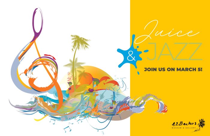 Enjoy a tuneful time on the Indian River for the return of the Backus Museum’s new choice outdoor concert event, “Juice & Jazz”! On Sunday, March 5 from 10:30-12:30, live music from the Fort Pierce Jazz & Blues Society on the Outdoor Mural Plaza complements a delicious assortment of sweet and savory delights with fresh juice from Natalie’s Orchid Island Juice Company, coffee and Mimosas, Bloody Marys, or Prosecco. At 12:30pm we crescendo to the drawing for the annual Win a Masterpiece of Florida Art Raffle.