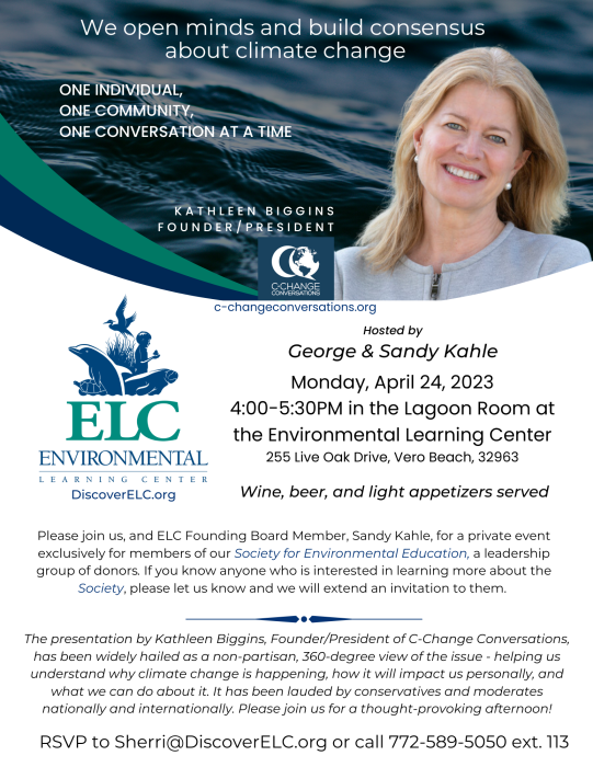 The Environmental Learning Center is hosting a talk by Kathleen Biggins, Founder and President of C-Change Conversations on Monday, April 24th from 4:00-5:30 PM. Her presentation has been widely hailed as a non-partisan, 360-degree view of the issue – helping us understand why climate change is happening, how it will impact us personally, and what we can do about it. With a goal to open minds and build consensus about climate change, this organization has been lauded by conservatives and moderates nationally and internationally. For more information about C-Change, visit the website www.C-ChangeCoversations.org