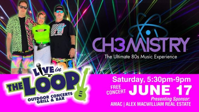 June 17, Chemistry is the premier synth-pop-rock tribute to the Decade of Decadence, the 80s. The Golden Age of big hair bands, synthesizers, parachute pants, Max Headroom and MTV! They’ll be ripping Awesome 80s tunes from Pat Benatar, Berlin, Missing Persons, The Motels, A Flock Of Seagulls, Duran Duran, Blondie, Loverboy, Quarterflash and a whole bunch more.
