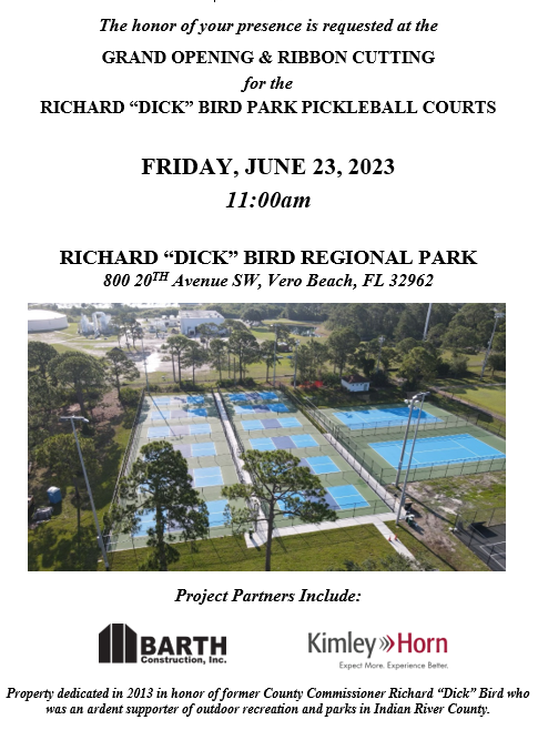 Pickleball lovers in IRC have something to cheer about. The Board of County Commissioners is excited to announce a brand new 12 court pickleball complex at the Richard “Dick” Bird Regional Park. A grand opening and ribbon cutting are set for 11 a.m. on Friday, June 23, 2023.