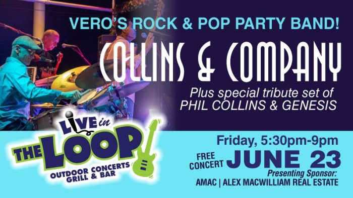 Riverside Theatre presents Live in the Loop on June 23, Collins & Company a popular local band that covers authentic music from Rock, Pop, Country, Motown & Reggae, will also be performing a special 1-hour set of Genesis & Phil Collins hits! Plus their playlist from Billy Joel, Bob Marley, Bob Seger, The Cars, CCR, CSN, Chuck Berry, David Bowie, The Drifters, The Eagles, Elton John, Journey, Lynyrd Skynyrd, The Beatles, The Who, Tom Petty, U2, Vince Gill and More!