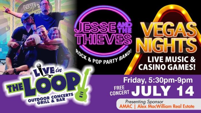 The lobby will be transformed into a Vegas-style Casino Night where patrons play for raffle tickets to win prizes donated by local merchants. Enjoy live music, food, and a full bar. The event is casual attire and no ticket is required to come inside the lobby to play! Continue the fun at The Comedy Zone with hilarious comedians (ticket required). Or enjoy a concert in The Loop (no ticket required)!