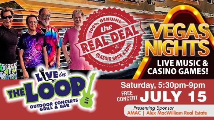 On July 15 The Real Deal plays music from The Doors, The Zombies, Creedence, Van Morrison, Santana, Steely Dan, Todd Rundgren, The Rascals, Queen, The Hollies, The Kinks, Badfinger, The Allman Brothers, Stevie Ray Vaughan, and of course The Beatles! All the cover hits that will get you dancing!