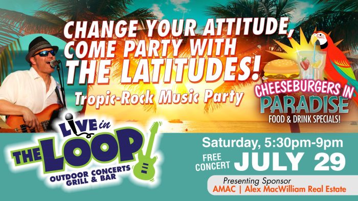 On July 29 The Lattitudes create a Tropical Rock Party… combining rock, reggae, funk, and country music, layered with multiple genres.