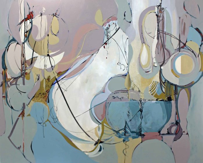 This unique exhibit presents juried work by varied artists from near and far, who have created pieces on theme of crystal – the symbol of 15th anniversaries. Artists have been inspired by topics that include celebration, clear, sparkling, lightness, clarity, and durability. At the June 2nd opening reception, show chair Mary Ann Hall announced winning pieces that had been chosen by judge Shotsi Lajoie . The First Place award went to Judy Burgarella for her painting entitled: “Simmering in the Moonlight”, the Second Place award went to Ellen Lindner for “Daydream”, a stitched fabric collage. The Third Prize was awarded to Ginny Piech Street and Anita Prentice for their collaborative mosaic-ceramic piece entitled “Fascinator” and Amanda Leshko received an honorable mention for her 18×24 watercolor entitled “Celebration Dance.”