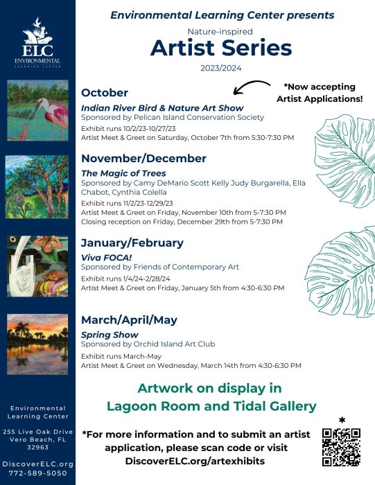 The Environmental Learning Center is committed to displaying artwork from a wide diversity of artists and artwork mediums that align with the mission to educate, inspire and empower all people to be active stewards of the environment and their own well-being. The 2023-2024 season of shows will offer a dynamic and exciting variety of art for visitors to enjoy. All of the artwork is for sale and the ELC benefits from a portion of the proceeds donated by each participating artist. The Artist Meet and Greet events are open to the public and feature live music and refreshments.
