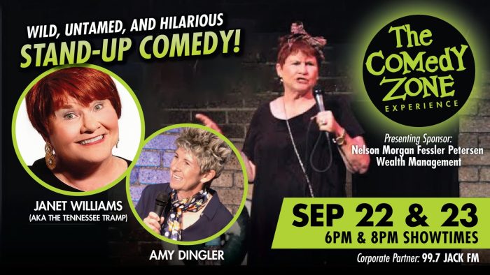 Headliner Janet Williams AKA ” The Tennessee Tramp” has a high-energy show packed with jokes about men and women issues, menopause, dating, prejudice, weight, love, and sex (and a lack of it)… the whole sha-bang!