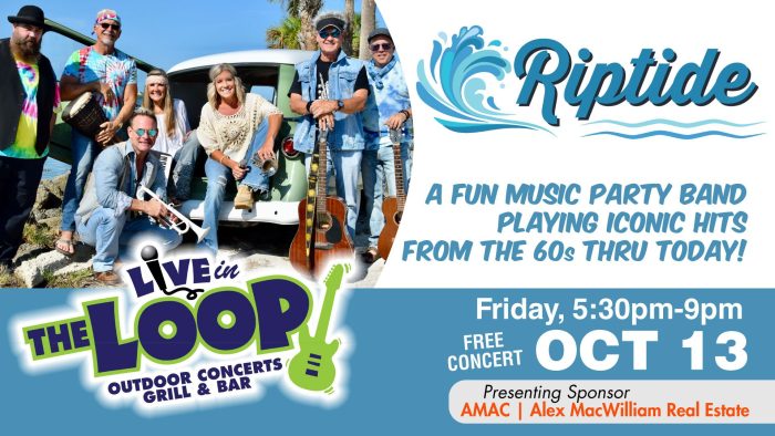 On October 13 Riptide is a FUN music party band playing a wide variety of iconic hits from the 60s thru Today with great harmonies, horn hooks and iconic guitar riffs that you’ll want to sing and dance to.