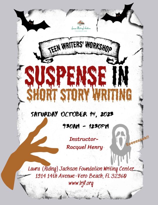 Laura Riding Jackson Foundation offers Suspense In Short Story Writing on October 14. A few Halloween-themed fun surprises while teens learn how, with words alone, one can build tension to the point where your reader can no longer repress a shriek of terror!