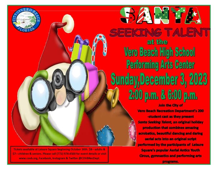 The City of Vero Beach Recreation Department will proudly present Santa Seeking Talent an original holiday production on December 3, 2023. The production will be held at the Vero Beach High School Performing Arts Center and there will be two shows, 2:00 p.m. and 6:00 p.m. Santa Seeking Talent is a heart-warming holiday tale that takes Santa and friends on an adventure seeking entertainers for a North Pole talent show. The talent show is meant to be a fun reward for the Elves and Reindeer who work year-round to bring holiday cheer to the children of the world. Along his journey, Santa realizes that every act he observes is creative and exceptional and he decides to bring them all back to the North Pole for a spectacular holiday showcase!