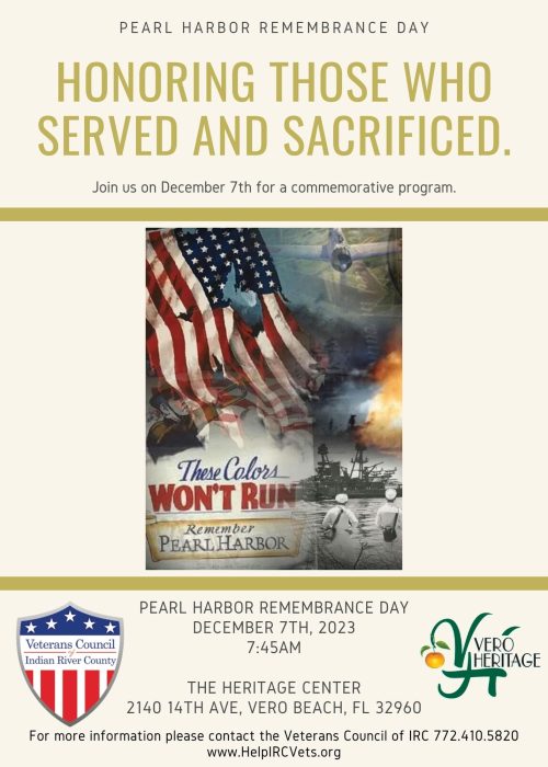 The Veterans Council of Indian River County (VCIRC) invites the community to join in honoring and remembering the historic events of Pearl Harbor on December 7th, 2023, at 7:45 am. The free commemorative program will take place at the Heritage Center, located at 2140 14th Ave, Vero Beach, FL 32960.