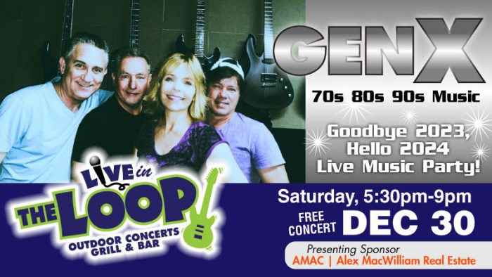 GOODBYE 2023, HELLO 2024 Pre-New Year’s Eve Live Music Party! The band GenX covers some of the top 40 tunes of the 70s 80s 90s from: Journey, Pat Benatar, Heart, AC/DC, Alanis Morrisette, Fleetwood Mac, Tonic, Talking Heads, Bon Jovi, The Police, No Doubt, Lit, Don Henley, 3 Doors Down, Gin Blossoms, Lita Ford, Green Day and so many more artists!