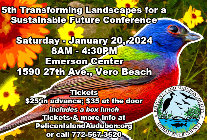 To keep our waters clean and preserve our unique Florida Habitat in IRC, you are invited to attend Pelican Island Audubon’s 5th annual conference, Transforming Landscapes for a Sustainable Future, on Jan 20, 2024 at the Emerson Center, 1590 27th Ave, Vero Beach, FL 32960. Registration starts at 8 a.m.; speaker presentations at 9 a.m. See the schedule, info, and bios of the great speakers on our website https://pelicanislandaudubon.org/2023/10/22/fifth-transforming-landscapes-for-a-sustainable-future-conference/ Register $25 in advance ($35 at the door). Attendees will be served a box lunch. Native Butterfly Flowers Nursery and Nancy’s Nursery will have native plants for purchase and experts demonstrating how to plant them.