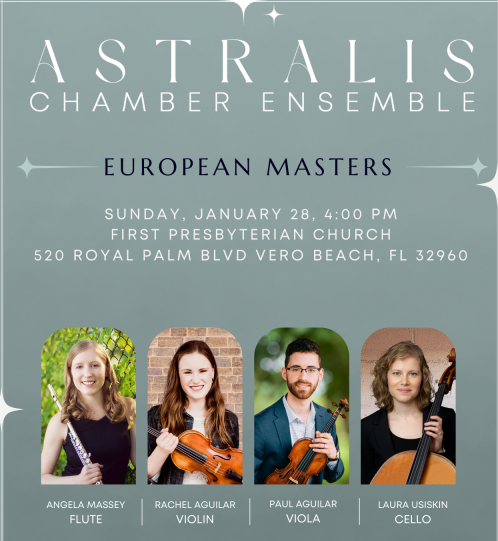 Vero Beach is about to receive a free musical gift: Talented performers from the touring Astralis Chamber Ensemble will stop in Vero Beach for a concert featuring the work of European Masters on Sunday, January 28.