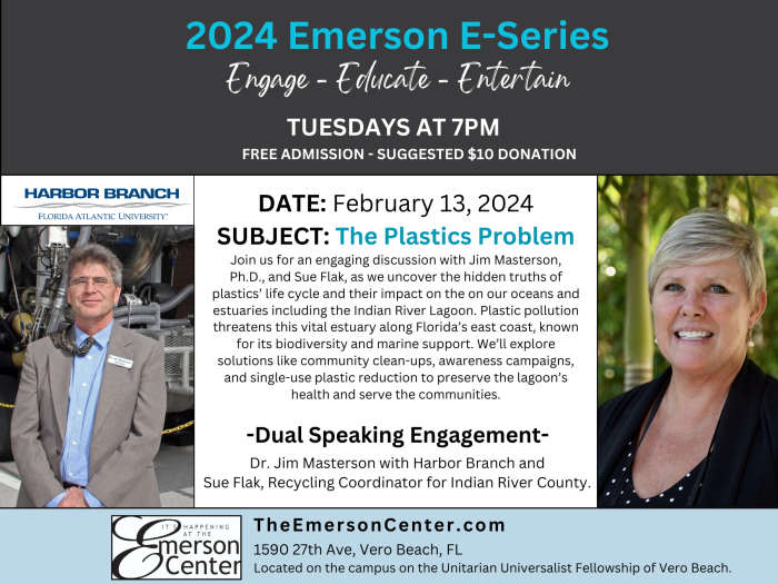 Join us for an engaging discussion with Jim Masterson, Ph.D., and Sue Flak, as we uncover the hidden truths of plastics’ life cycle and their impact on the on our oceans and estuaries including the Indian River Lagoon. Plastic pollution threatens this vital estuary along Florida’s east coast, known for its biodiversity and marine support. We’ll explore solutions like community clean-ups, awareness campaigns, and single-use plastic reduction to preserve the lagoon’s health and serve the communities.