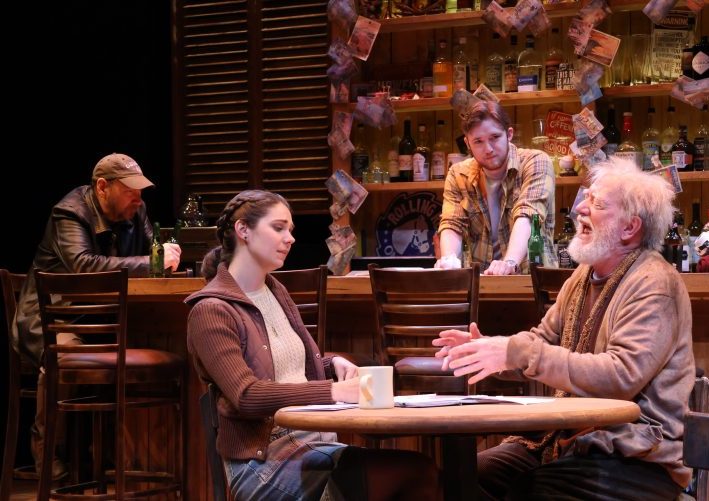 Yankee Tavern is a four-person play currently showing on the Riverside Theatre Waxlax Stage that takes place five years after 9-11. The namesake bar is scheduled for demolition, as well as the hotel in which it is located. Adam (played by Patrick M. Byrnes) is a young graduate student running the bar since the death of his father. Janet (played by Emily Verla) is his fiancée. They are discussing their wedding invitations when a longtime customer, Ray (played by Steve Brady), staggers in. He lives upstairs in the condemned hotel, apparently a vagrant and apparently alone.