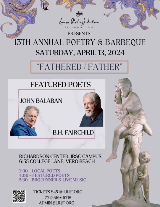 Laurel Riding Jackson Foundation hosts its Annual 13th Annual Poetry & BBQ on Apr 6, 2:30-7pm at Richardson Center, Indian River State College, Vero Beach Campus. This year’s event features poets John Balaban and George Bilgere.