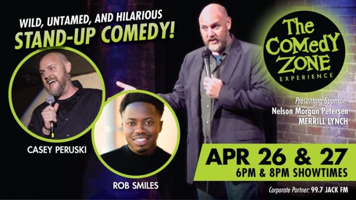Riverside’s The Comedy Zone on April 26 & 27, 6 & 8 pm. Casey Peruski & Rob Smiles Headliner Casey Peruski known as the Nice Guy of comedy (unless you interrupt him on stage) is very inviting while being very funny.