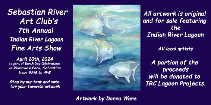 Sebastian River Art Club’s 7th Annual Indian River Lagoon Fine Arts Show on April 20, 9am – 4pm. All original artworks is for sale featuring the Indian river Lagoon. Riverview Park in Sebastian.