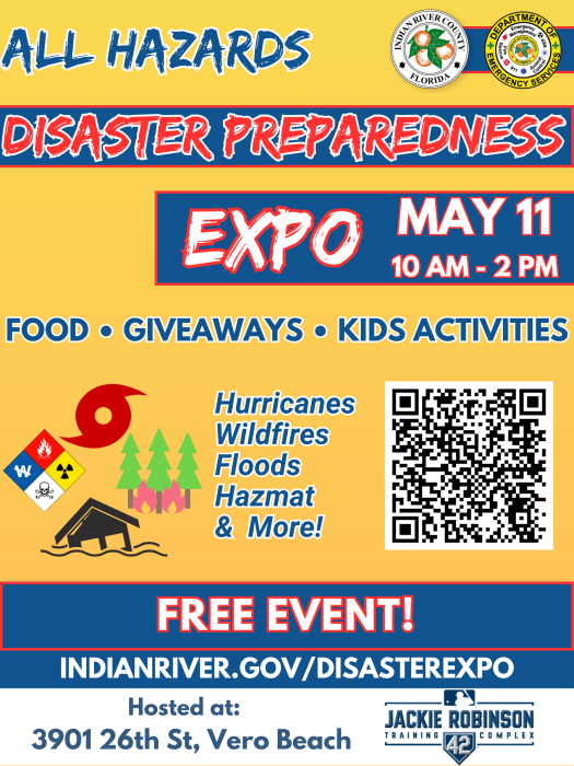May 4, 2024 miltthomas Disaster Preparedness Expo May 11 news release On Saturday May 11, 2024, the IRC Department of Emergency Services shall host a free/indoor Disaster Preparedness Expo at the Jackie Robinson Training Center in Vero Beach. The Expo will be from 10:00 AM until 2:00 PM. Share this: Click to share on X (Opens in new window) X Click to share on LinkedIn (Opens in new window) LinkedIn Click to share on Facebook (Opens in new window) Facebook Click to share on WhatsApp (Opens in new window) WhatsApp Click to email a link to a friend (Opens in new window) Email Click to print (Opens in new window) Print Click to share on Pinterest (Opens in new window) Pinterest Click to share on Nextdoor (Opens in new window) Nextdoor Click to share on Threads (Opens in new window) Threads Click to share on Bluesky (Opens in new window) Bluesky Like Loading... Related