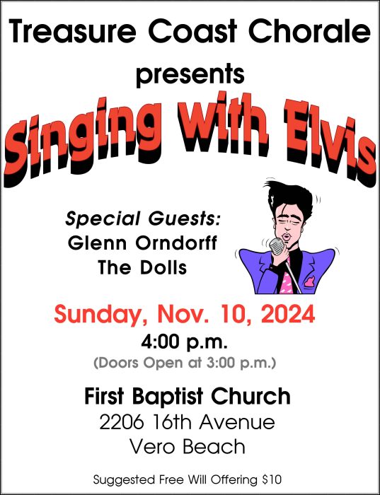 Singing With Elvis on November 10, 4 – 5:30pm. Treasure Coast Chorale is proud to keep Presley’s worldwide fame going. The special guest appearance of Glenn Orndorff will have you “All Shook Up!” Performance at First Baptist Church, 2206 16th Ave. in Vero Beach.