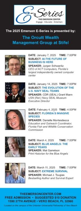 The Emerson Center is located at 1590 27th Ave, Vero Beach, FL. Doors open one hour prior to each lecture. While admission to the E-Series is free, a suggested donation of $10 is greatly appreciated. Mark your calendars for these exciting speaking events!