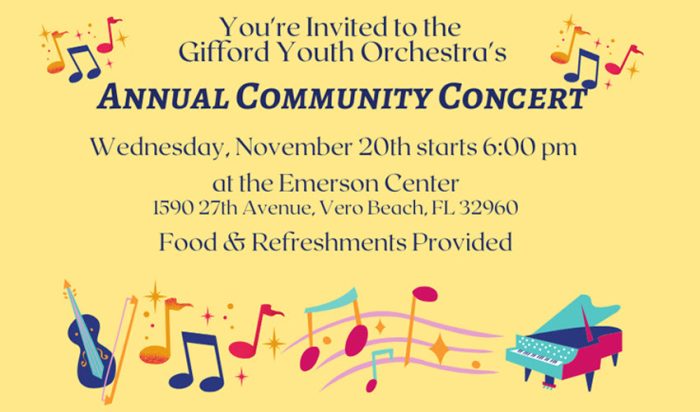 Gifford Youth Orchestra offers Annual Community Concert on November 20, 6pm at The Emerson Center, 1590 27th Ave in Vero Beach.