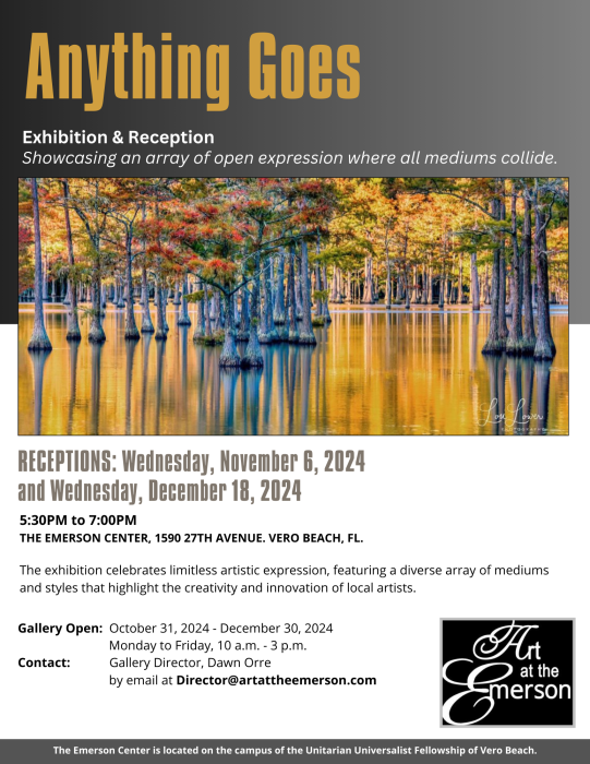 Anything Goes Exhibition at Art at the Emerson Gallery: An Array of Open Expression Where All Mediums Collide . On view through December 30. This event showcases a diverse range of works from local artists across all mediums, from painting and sculpture to digital art and mixed media. Featuring a broad spectrum of styles and techniques, the exhibition highlights the boundless possibilities of artistic expression, inviting viewers to engage with the raw, unfiltered creativity of the artists.