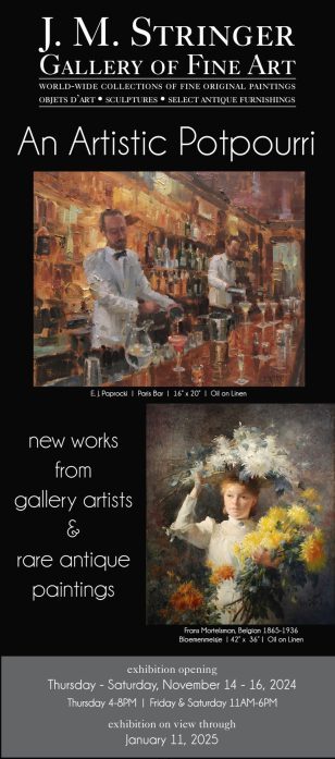 JM Stringer Gallery of Fine Art presents An Artistic Potpourri, an exhibition featuring new works from gallery artists and rare antique paintings.