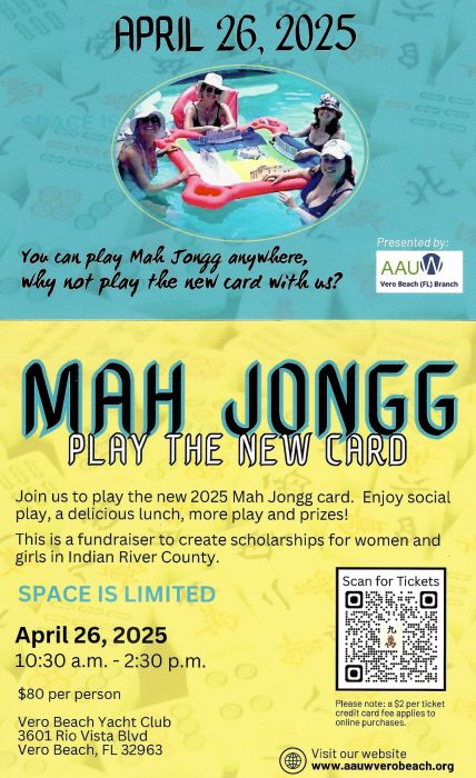 AAUW-Vero Beach is excited to announce the “Play the New Card” Mah Jongg fundraising event on Saturday, April 26, at the Vero Beach Yacht Club. This special event invites players of all skill levels to experience the new Mah Jongg card, enjoy a delicious lunch and win prizes and gift certificates donated by our local shops and restaurants— and all in support of scholarships for women and girls in Indian River County.
